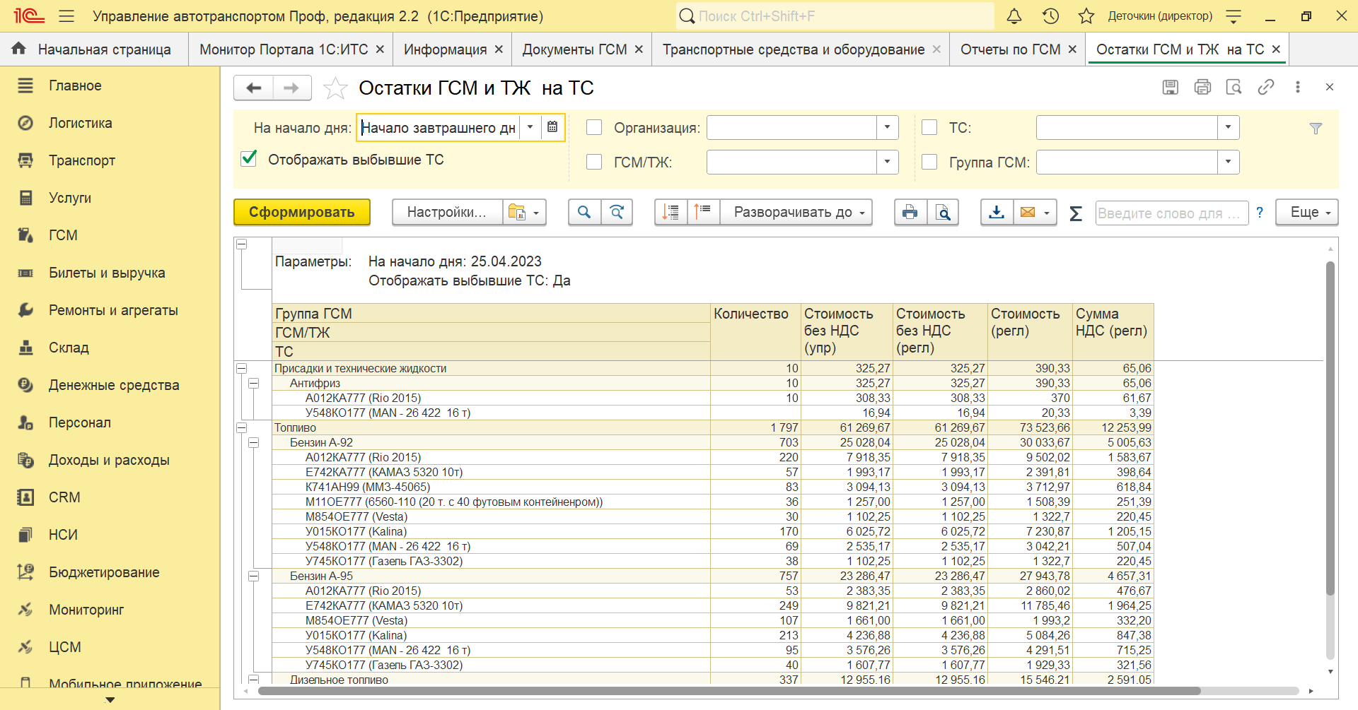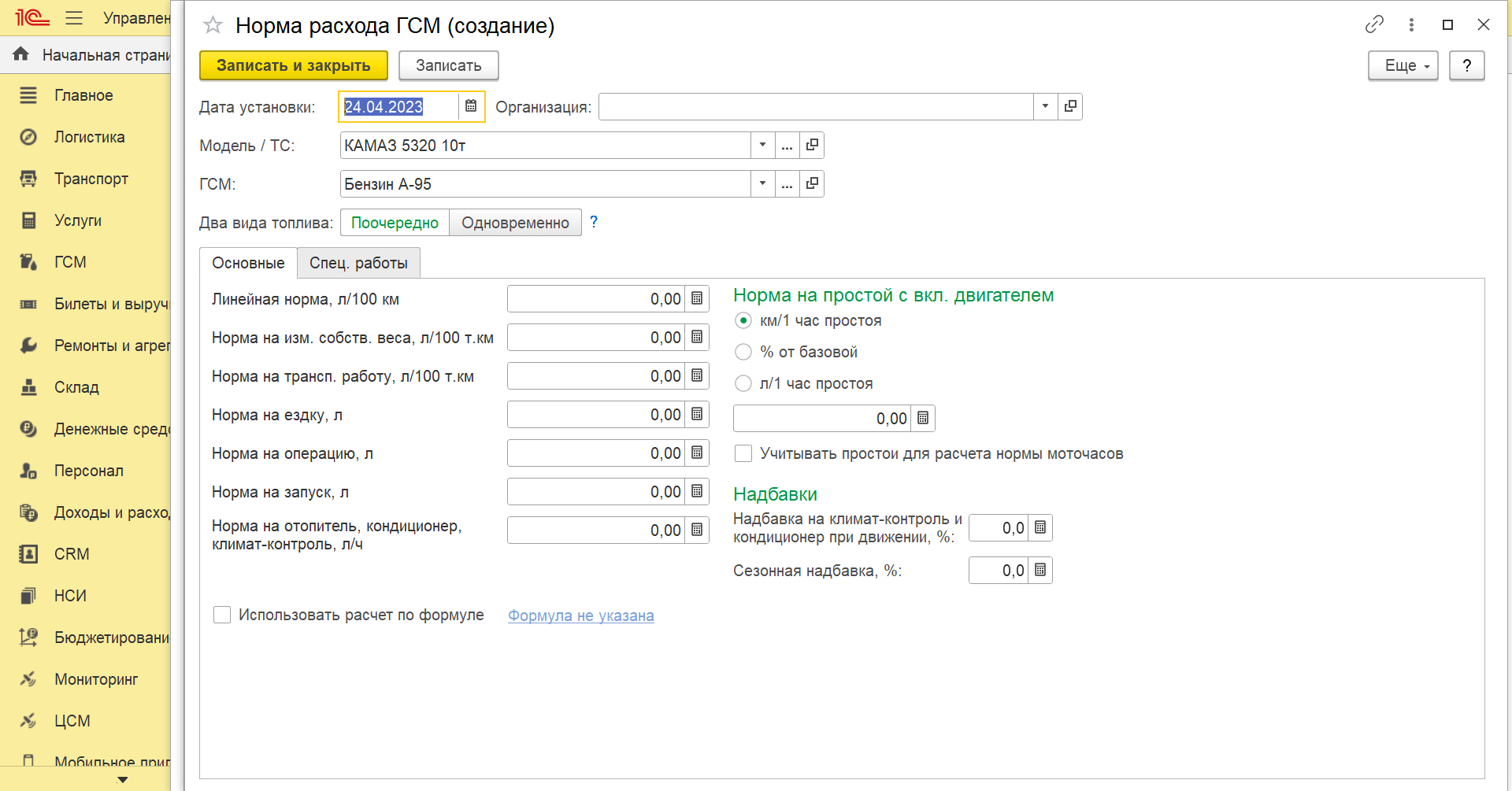 Для автомобилей возможно учитывать базовые нормы расхода ГСМ, а также нормы расхода топлива на специальные работы.