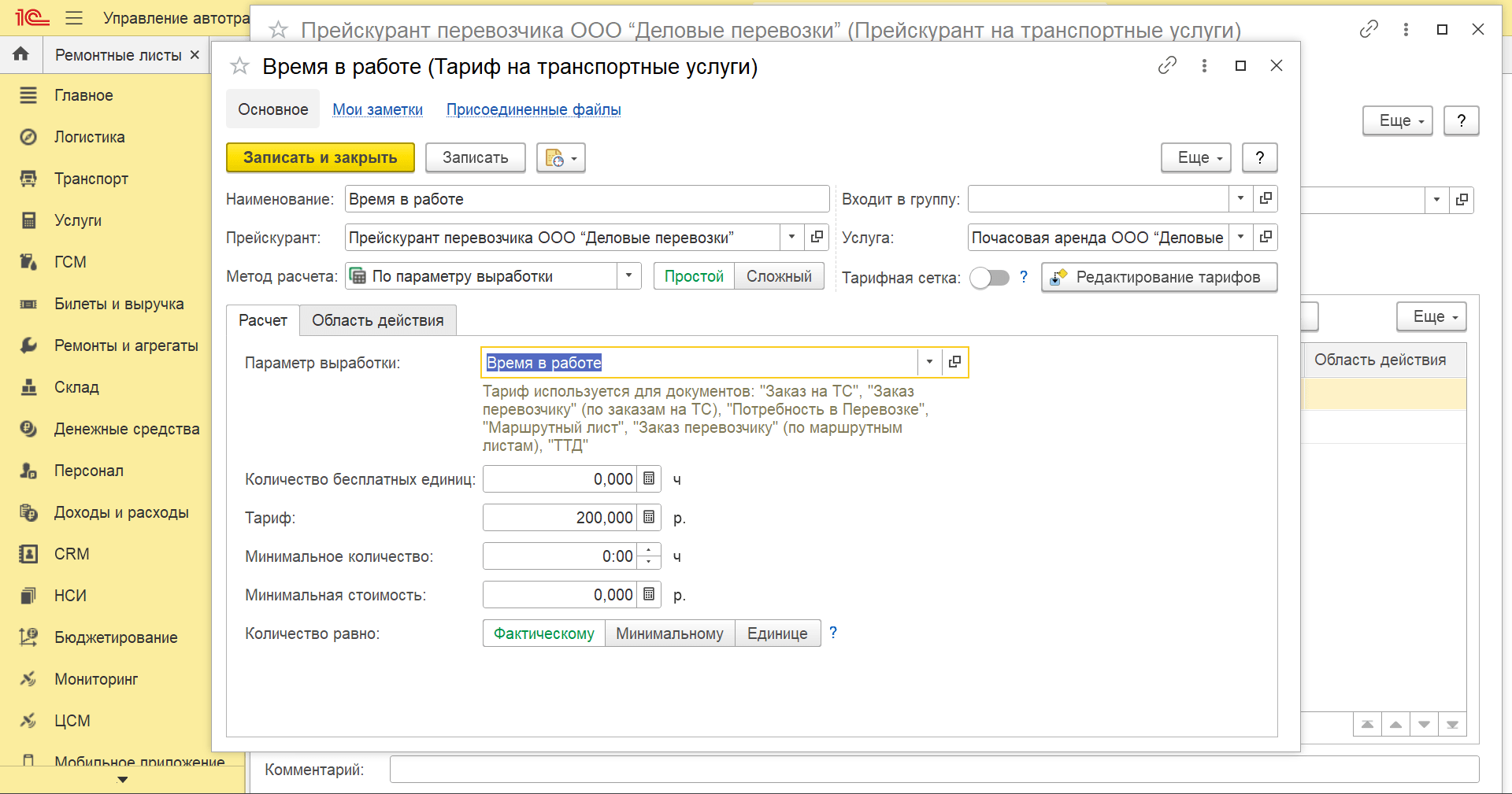 Отличительная особенность программы — продуманный справочник тарифов, позволяющий создавать сложные тарифы с различными группировками (например, по весу или классу груза), гибко настраивать области их действия для контрагентов и договоров контрагентов, для маршрутов, моделей ТС, автомобилей и проч.