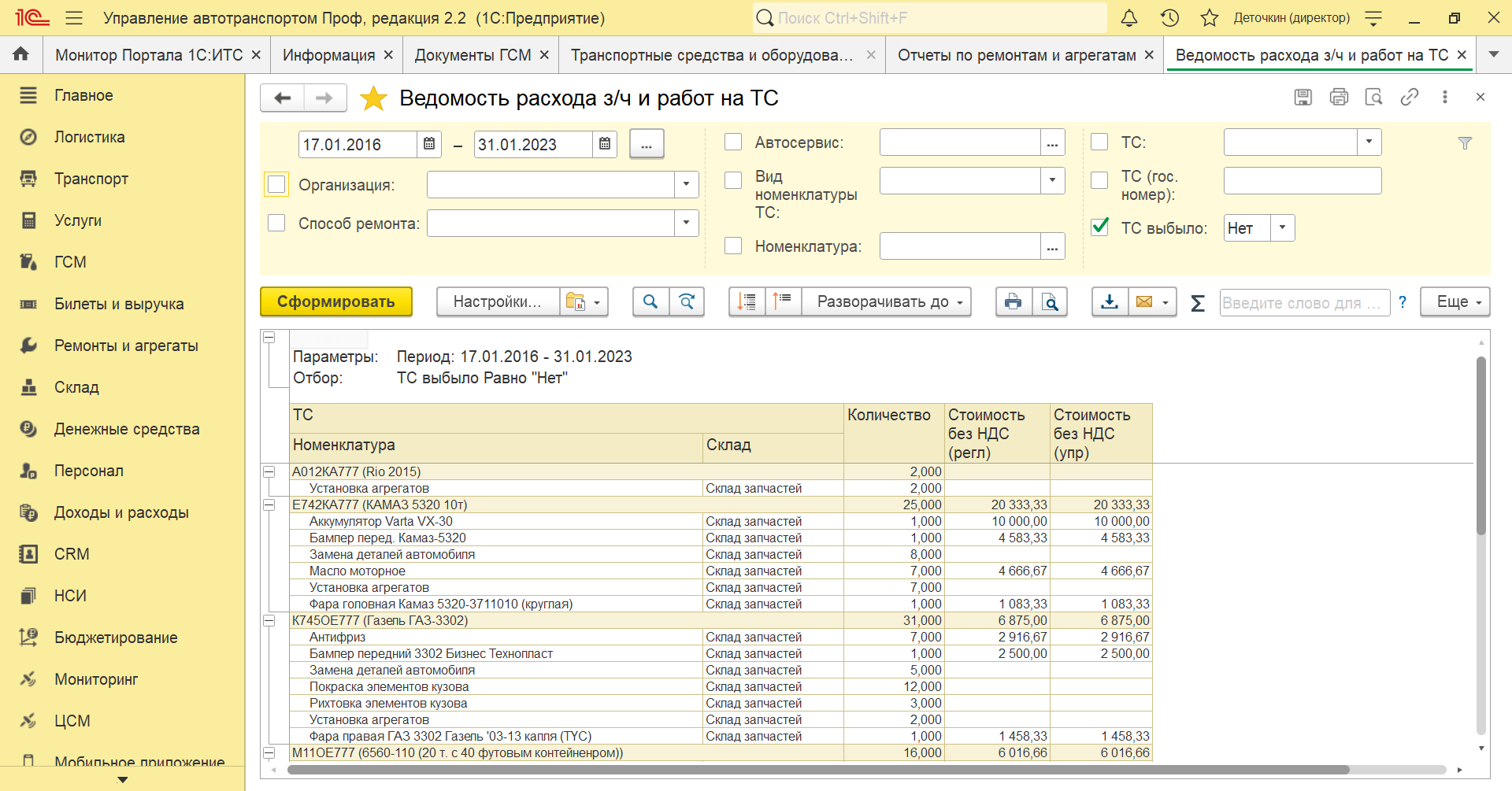 Контроль ГСМ, запчастей, ремонтов и пр.