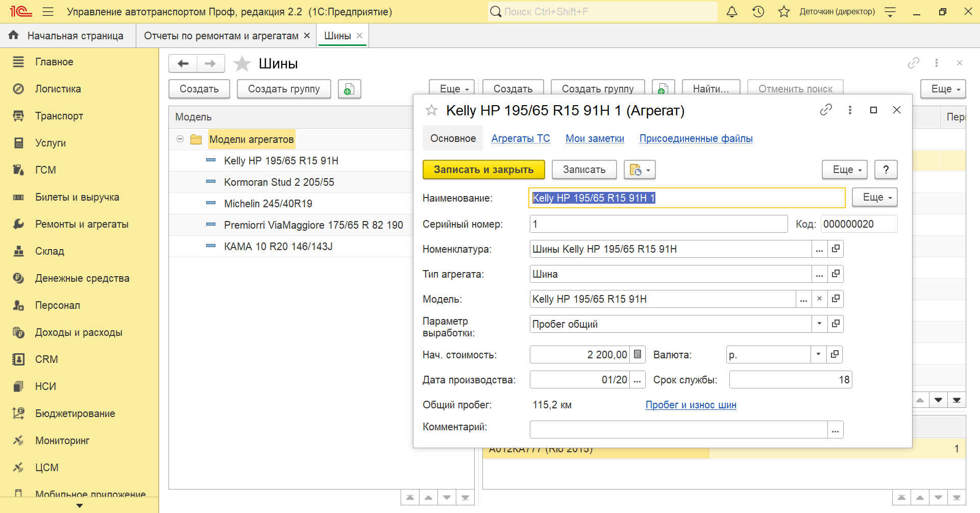 Учет агрегатов выполняется в разрезе каждого автомобиля, а шин — еще и в разрезе мест установки.