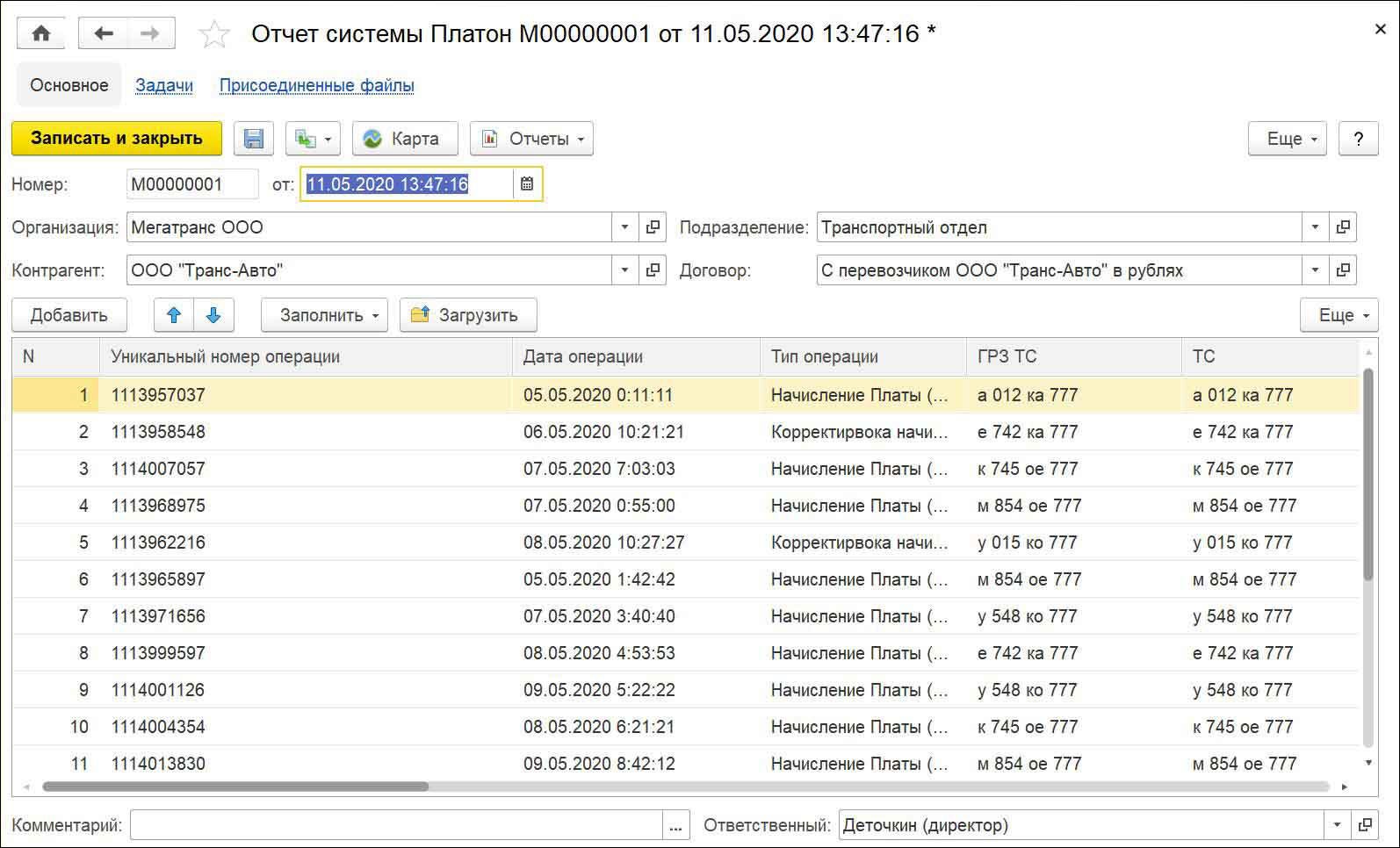 В документ «Отчет системы Платон» можно загрузить данные из отчетов системы «Платон»: «Выписка операций» и «Логистический отчет».