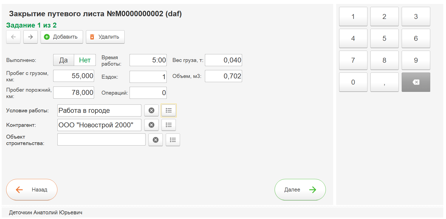 При закрытии путевого листа сканер терминала считывает штрих-код на путевом листе, открывается путевка и водитель последовательно вводит итоговые данные по рейсу.